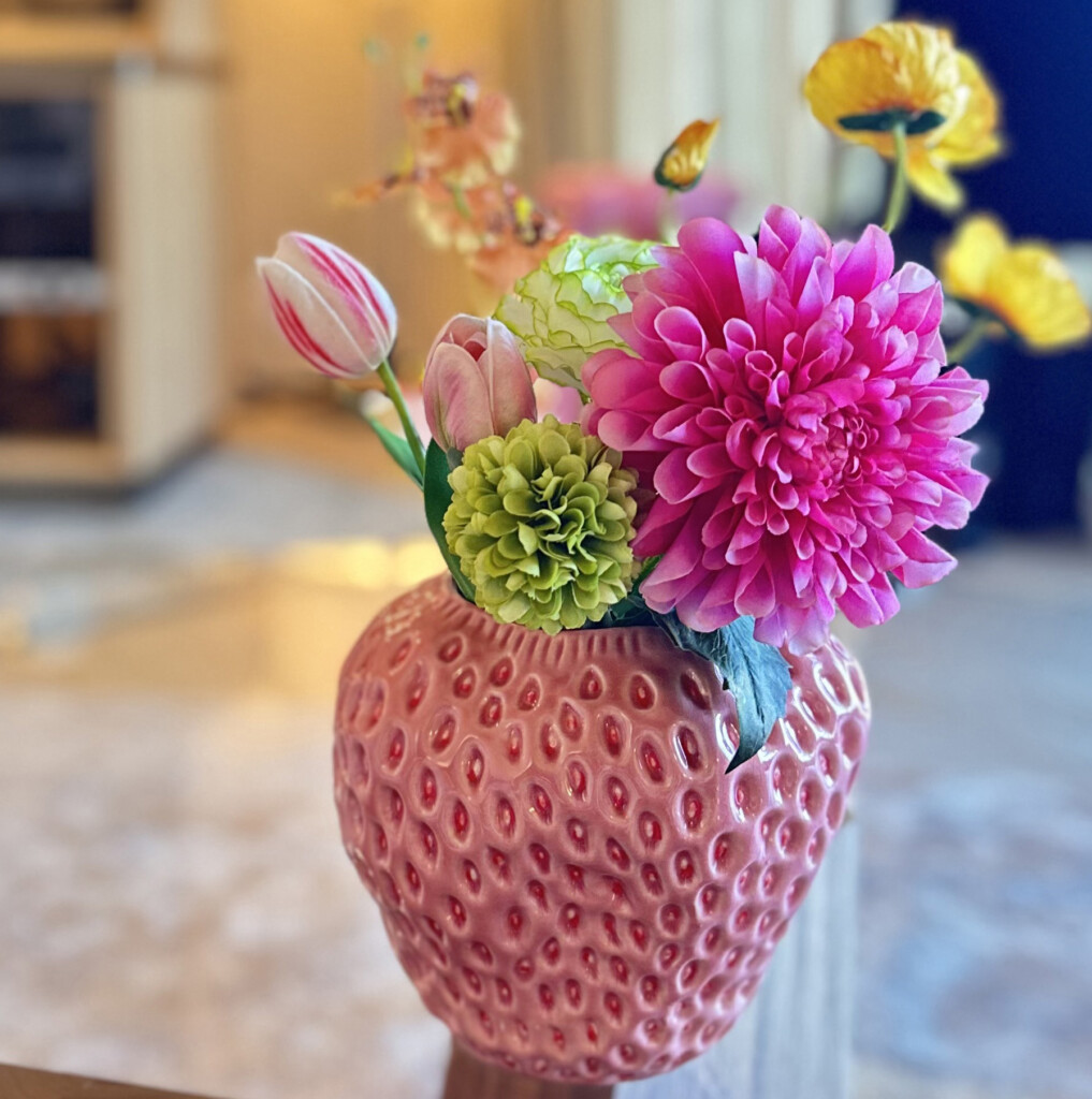 テーブルには小ぶりなフラワーアレンジを。イチゴ柄の印象的なフラワーベースに色鮮やかでフレッシュな印象のお花をコーディネート。お客様のイメージに合うデザインのものをチョイスしています。