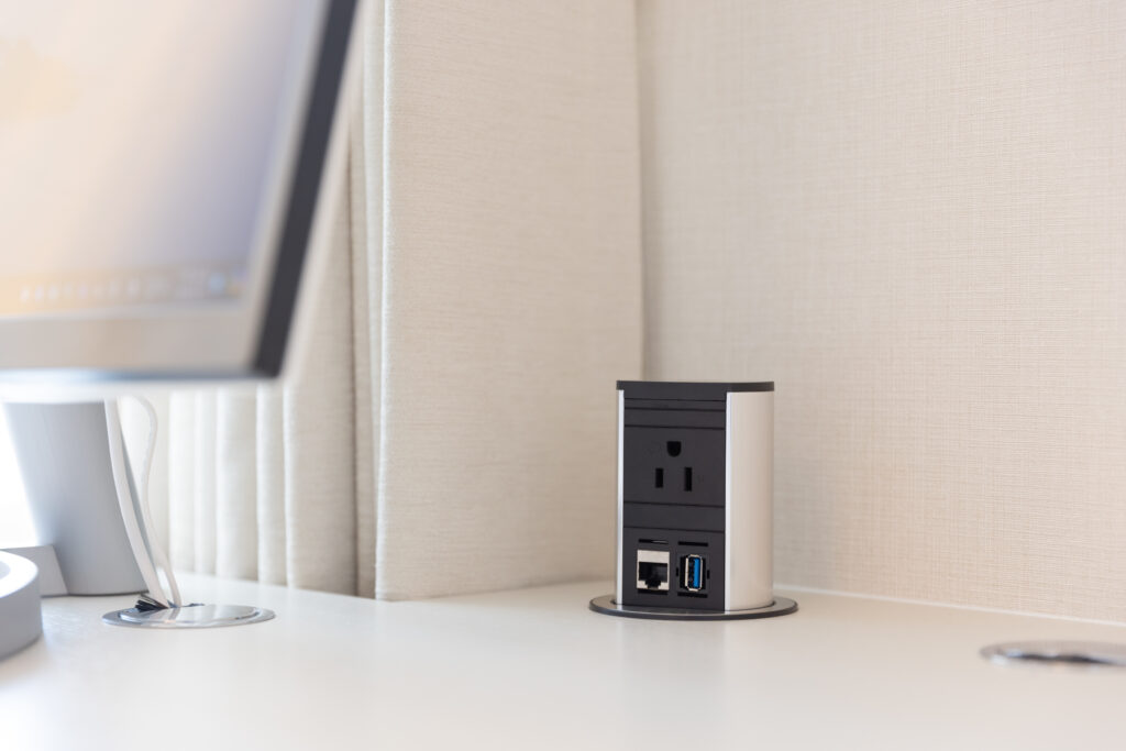 変形のお部屋の窓辺部分に在宅ワーク用のデスクのデザイン・制作をご依頼いただいた事例。マテリアルのコーディネートもお客様と何度も打ち合わせとサンプル制作を重ねながら形にしました。エレベーター式のコンセントを天板に設置、プリンターやPC本体もスッキリと収納し機能面も充実させました。