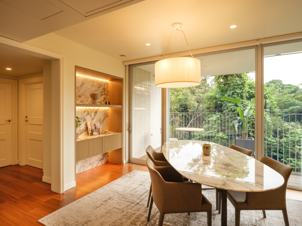 ダイニングに元々あったニッチスペースの使い方に困っていらしたお施主様に、飾り棚と収納を兼ねたオーダーメイドのシェルフをデザインしました。ともすれば物置になりがちなスペースが、フォーカルポイントとして生かされました。