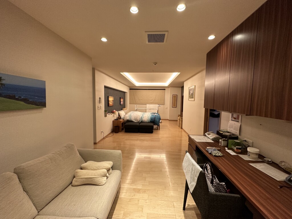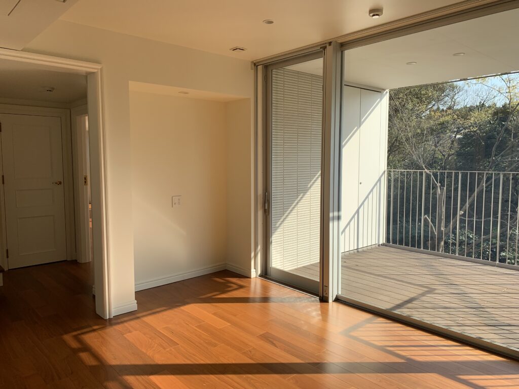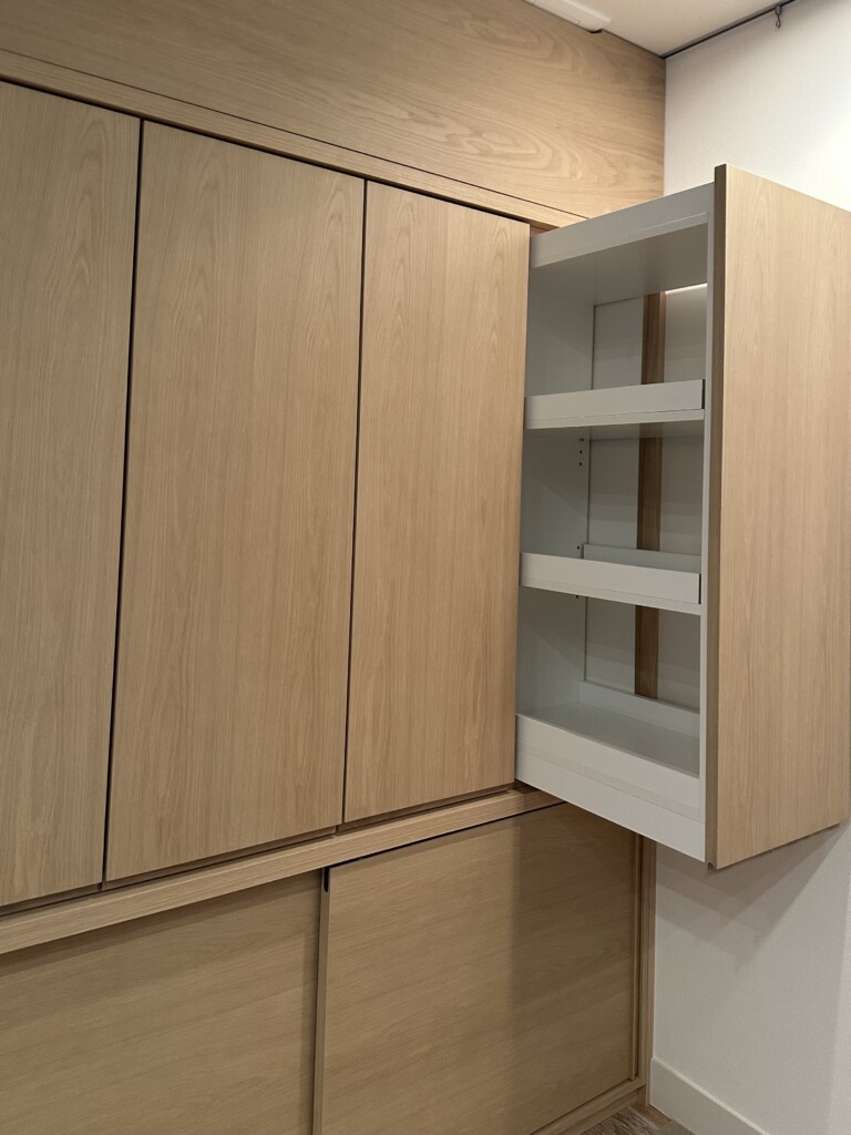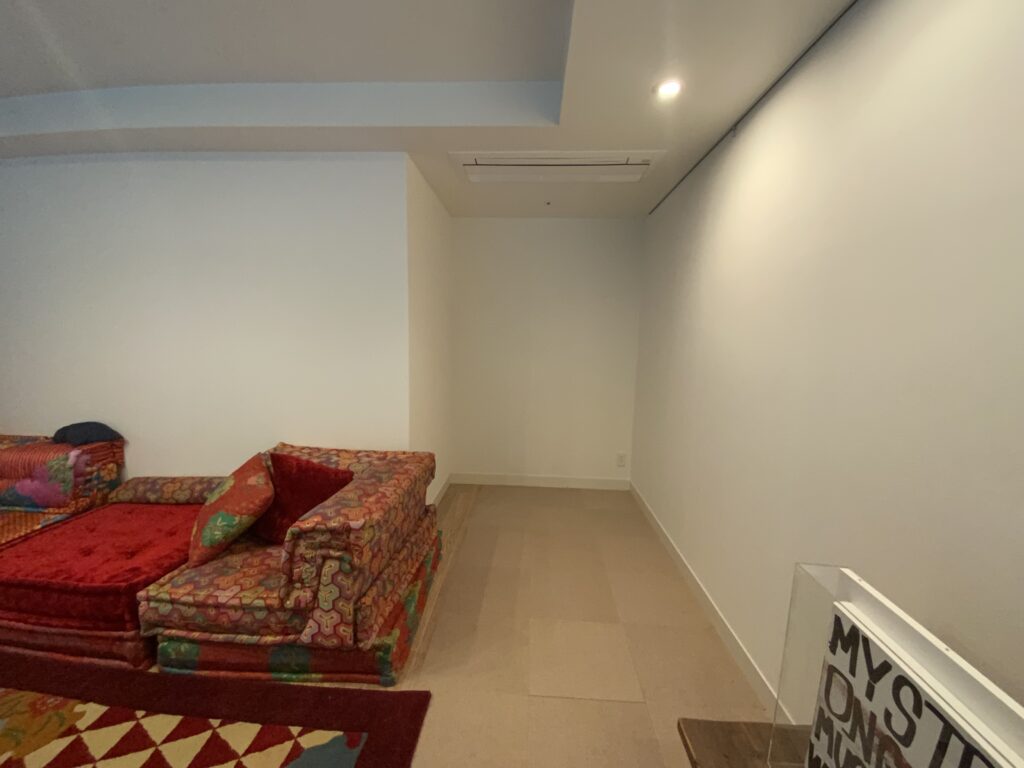 代々木にある高級賃貸マンションのインテリアデザイン事例です。リビングの一角あるデッドスペースはかなり勿体無い空間でした。荷物の多いお施主様のために、オーダーで収納を制作しました。奥行きもたっぷりあるので下部は来客用の寝具をしまうスペース、上段は重量用の引き出しキャビネットで大容量の収納を確保しました。