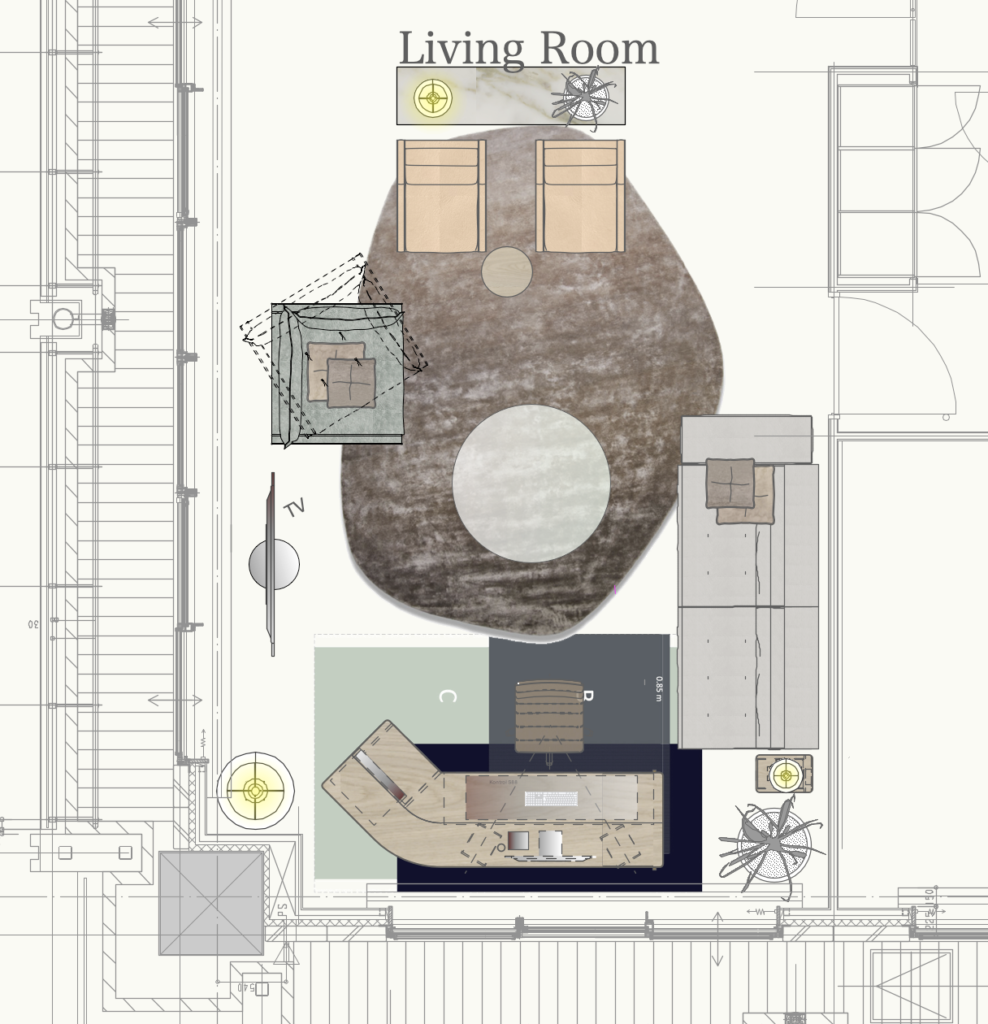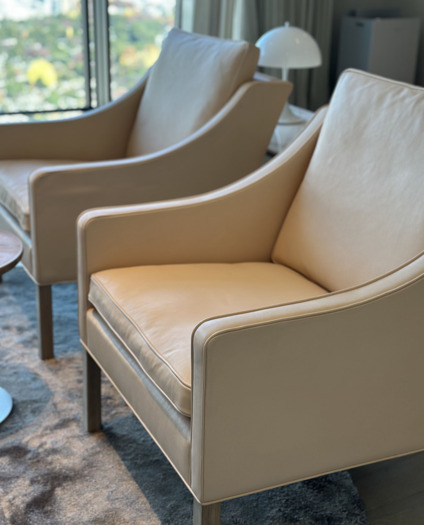 ソファは座る人の体型や年齢によっても好みが分かれるアイテムなので、ご提案時にはなるべくショールームにお連れして体感していただくようにしています。今回4つのメーカーさんのインテリアツアーをしてお選びいただいたソファはBaxterの3人掛けと一人掛け、Fredericiaの1人掛けを2つの組み合わせてコの字型に配置するプラン。