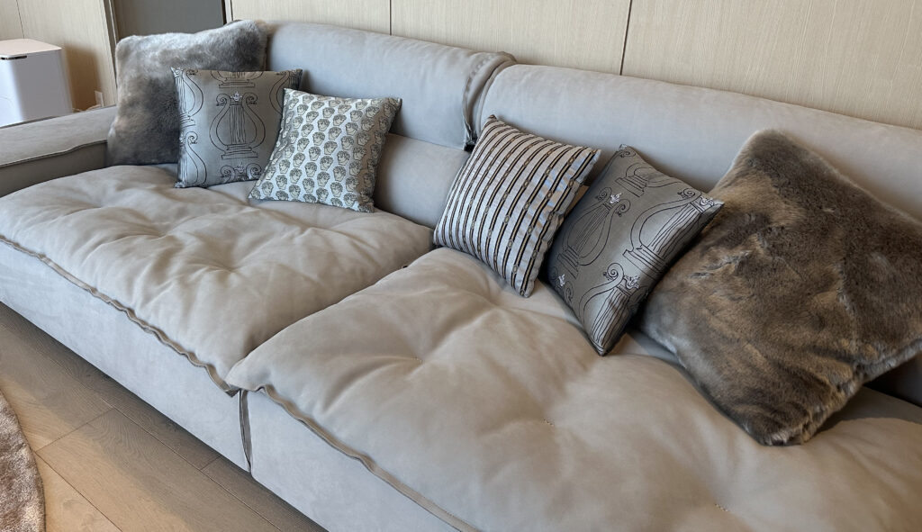 テレビの対面にはBaxter/Miami Softの3人掛けのソファを配置しました。RUBELLI(MANASトレーディング)のファブリックで製作したARdesign.オリジナルクッションをコーディネートしています。