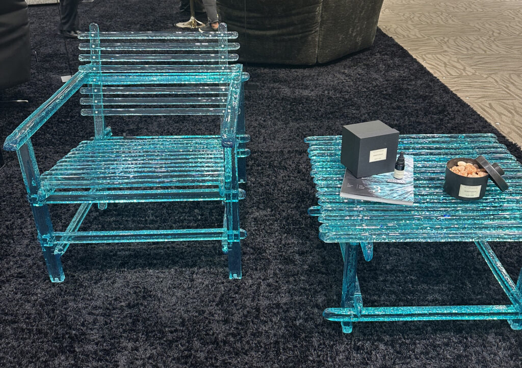 この目が覚めるようなブルーのアウトドアチェアとテーブル。一本一本手作りで作られたポリカーボネート製のスティックは弾力性、耐久性もあります。こちらのスティックを固定するビスの開発になんと5年も要したのだとか。