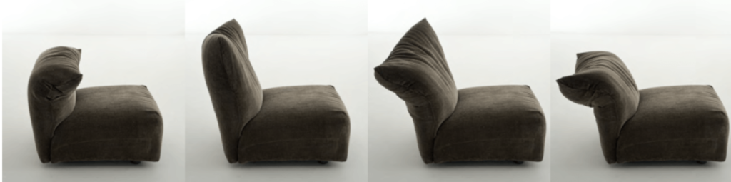 日本で一番人気なのはこちらのON the rocksだそうです。背もたれが岩のようなデザインからくるこのネーミング。自由に背もたれを動かすことができ、座る場所を選ばないソファです。
