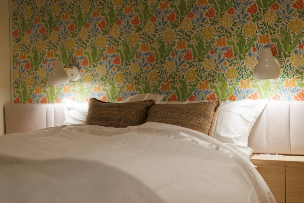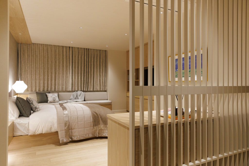 日本各地のラグジュアリーホテルをご存知の奥様に心からホッとできるベッドルームで過ごしていただきたく、ホテルライクな中に和の素材を織り込んだ空間に演出しました。鮮やかな花柄のお好きな娘様のお部屋のアクセントクロスはウィリアムモリス。オークと塗装のツートーンカラーでデザインしました。そして2つのお部屋を繋ぐ格子引き戸は和のテイストを感じながらも塗装仕上げにしたことで2つの空間を緩やかに分ける要素として上手く溶け込んでいます。